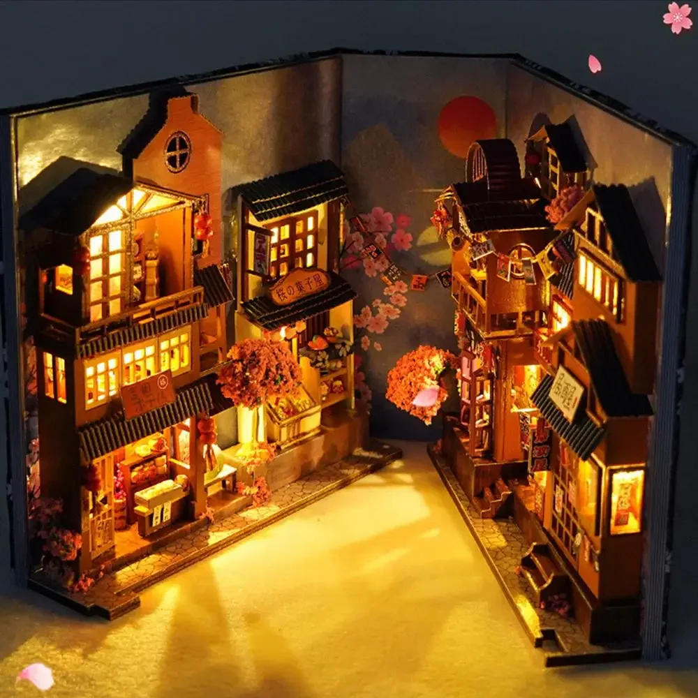 DIY Creative Book Nook Kit Decorative Japanese Style Bookend Insert Bookcase Book Stand Miniature House with LED Light Gift