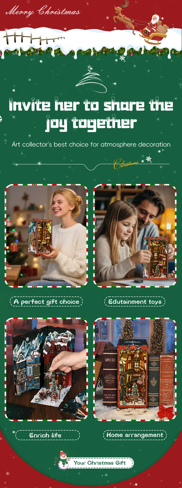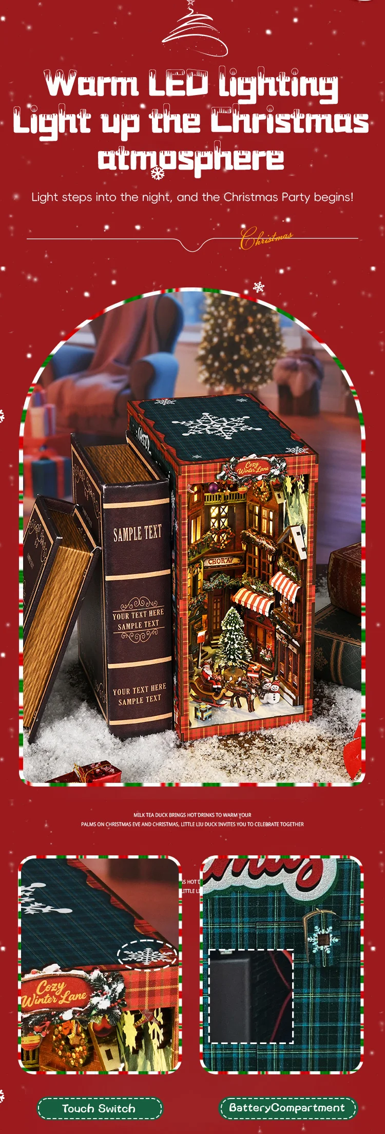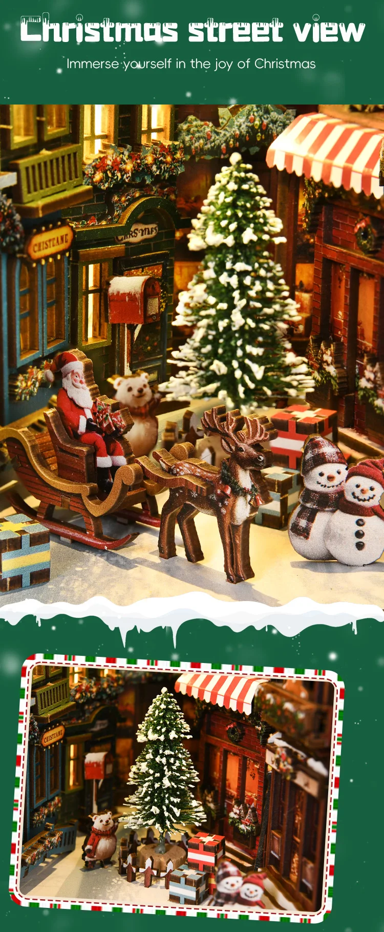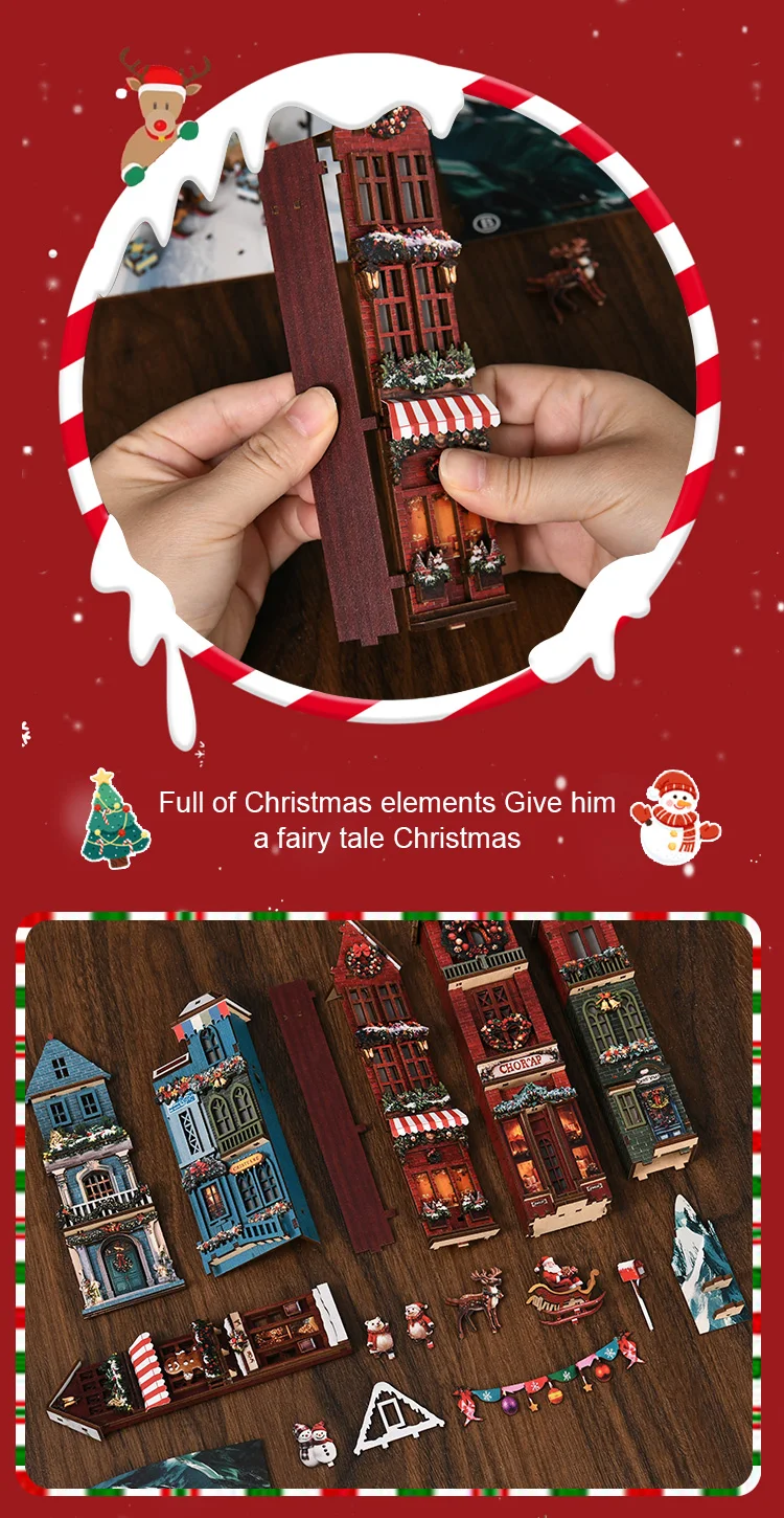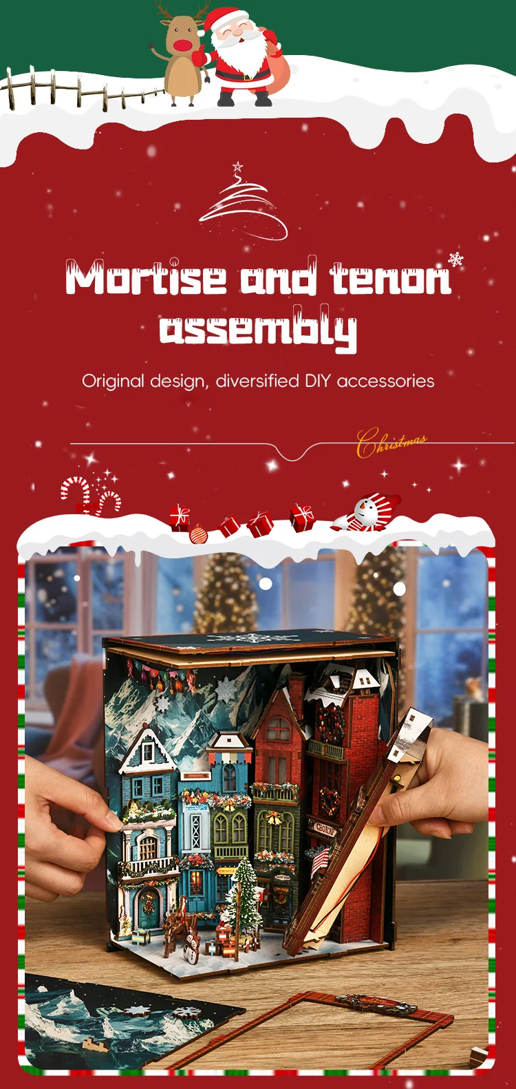 NEW DIY Book Nook Wooden Miniature Model Kits Christmas Street Corner Bookend 3D Puzzle with Light Bookshelf for Friends Gifts